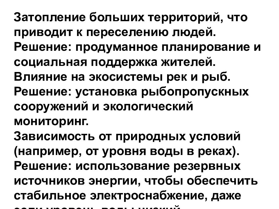 Затопление больших территорий, что приводит к переселению людей. Решение: продуманное планирование и социальная поддержка жителей. Влияние на экосистемы рек и рыб. Решение: установка рыбопропускных сооружений и экологический мониторинг. Зависимость от природных условий (например, от уровня воды в реках). Решение: использование резервных источников энергии, чтобы обеспечить стабильное электроснабжение, даже если уровень воды низкий.