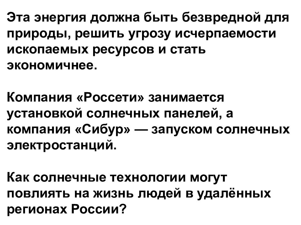 Эта энергия должна быть безвредной для природы, решить угрозу исчерпаемости ископаемых ресурсов и стать экономичнее. Компания «Россети» занимается установкой солнечных панелей, а компания «Сибур» — запуском солнечных электростанций. Как солнечные технологии могут повлиять на жизнь людей в удалённых регионах России?