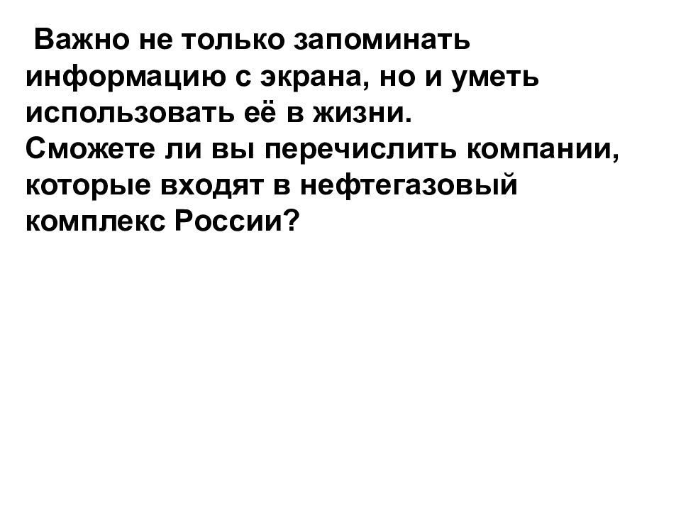Важно не только запоминать информацию с экрана, но и уметь использовать её в жизни. Сможете ли вы перечислить компании, которые входят в нефтегазовый комплекс России?