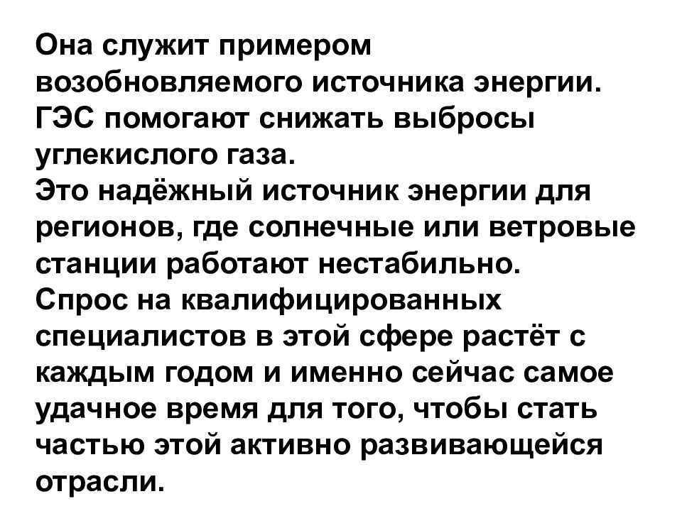 Она служит примером возобновляемого источника энергии. ГЭС помогают снижать выбросы углекислого газа. Это надёжный источник энергии для регионов, где солнечные или ветровые станции работают нестабильно. Спрос на квалифицированных специалистов в этой сфере растёт с каждым годом и именно сейчас самое удачное время для того, чтобы стать частью этой активно развивающейся отрасли.