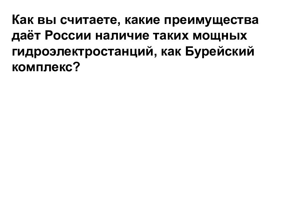 Как вы считаете, какие преимущества даёт России наличие таких мощных гидроэлектростанций, как Бурейский комплекс?