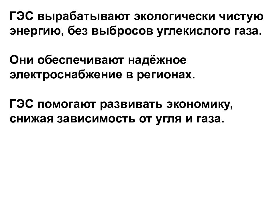 ГЭС вырабатывают экологически чистую энергию, без выбросов углекислого газа. Они обеспечивают надёжное электроснабжение в регионах. ГЭС помогают развивать экономику, снижая зависимость от угля и газа.