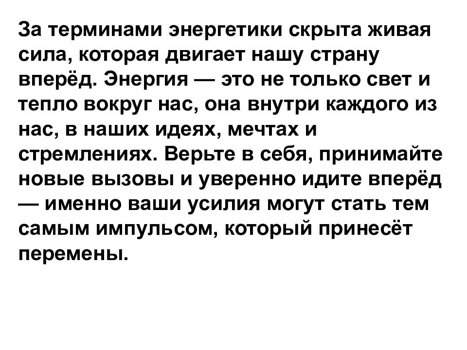 За терминами энергетики скрыта живая сила, которая двигает нашу страну вперёд. Энергия — это не только свет и тепло вокруг нас, она внутри каждого из нас, в наших идеях, мечтах и стремлениях. Верьте в себя, принимайте новые вызовы и уверенно идите вперёд — именно ваши усилия могут стать тем самым импульсом, который принесёт перемены.