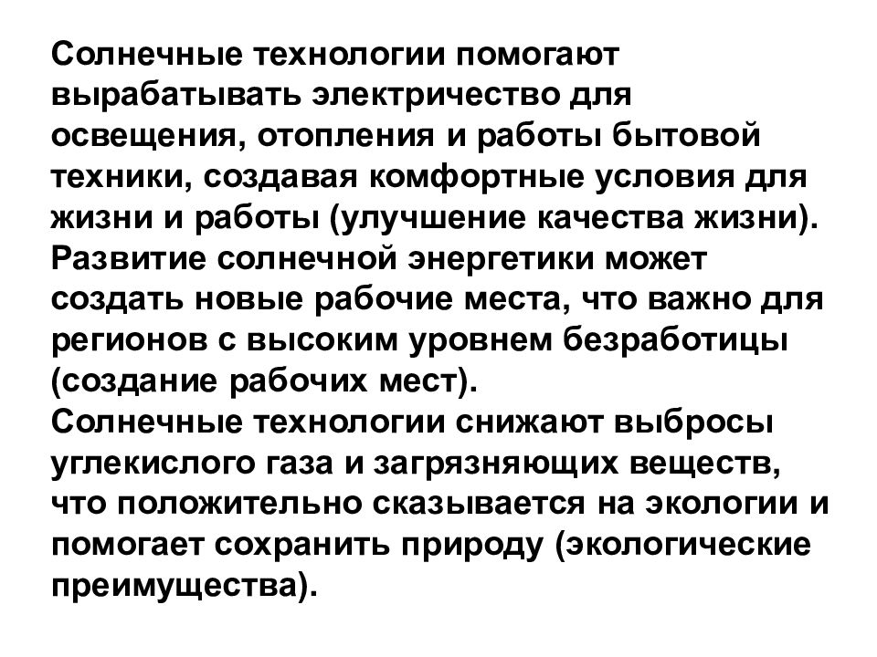 Солнечные технологии помогают вырабатывать электричество для освещения, отопления и работы бытовой техники, создавая комфортные условия для жизни и работы (улучшение качества жизни). Развитие солнечной энергетики может создать новые рабочие места, что важно для регионов с высоким уровнем безработицы (создание рабочих мест). Солнечные технологии снижают выбросы углекислого газа и загрязняющих веществ, что положительно сказывается на экологии и помогает сохранить природу (экологические преимущества).