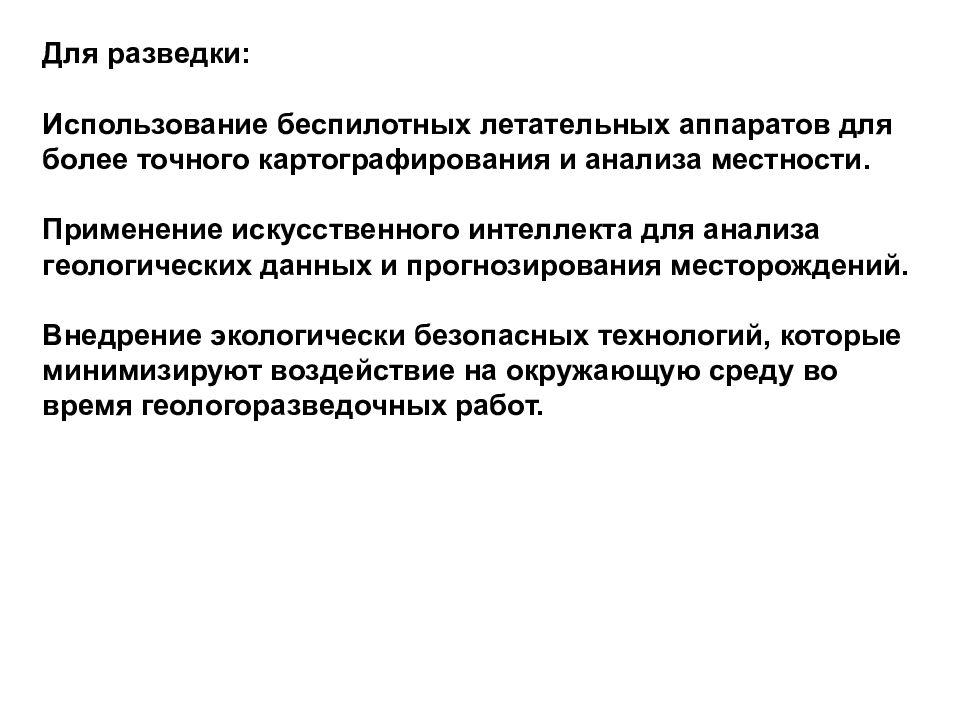 Для разведки: Использование беспилотных летательных аппаратов для более точного картографирования и анализа местности. Применение искусственного интеллекта для анализа геологических данных и прогнозирования месторождений. Внедрение экологически безопасных технологий, которые минимизируют воздействие на окружающую среду во время геологоразведочных работ.