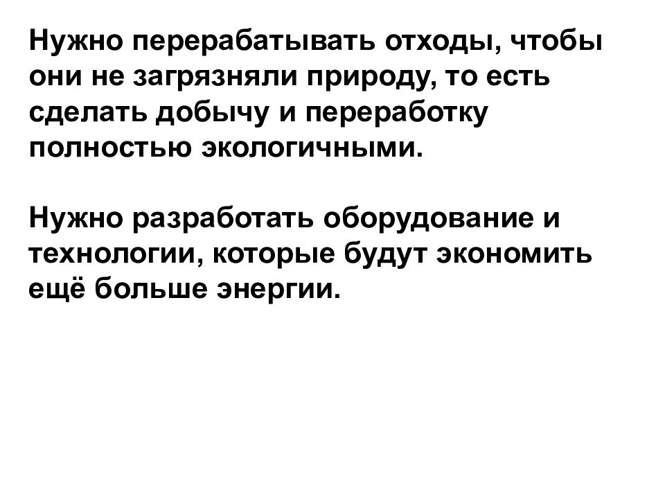 Нужно перерабатывать отходы, чтобы они не загрязняли природу, то есть сделать добычу и переработку полностью экологичными. Нужно разработать оборудование и технологии, которые будут экономить ещё больше энергии.