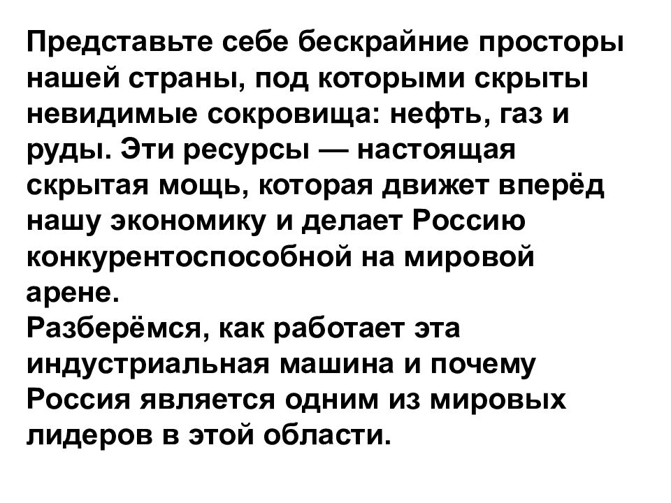 Представьте себе бескрайние просторы нашей страны, под которыми скрыты невидимые сокровища: нефть, газ и руды. Эти ресурсы — настоящая скрытая мощь, которая движет вперёд нашу экономику и делает Россию конкурентоспособной на мировой арене. Разберёмся, как работает эта индустриальная машина и почему Россия является одним из мировых лидеров в этой области.