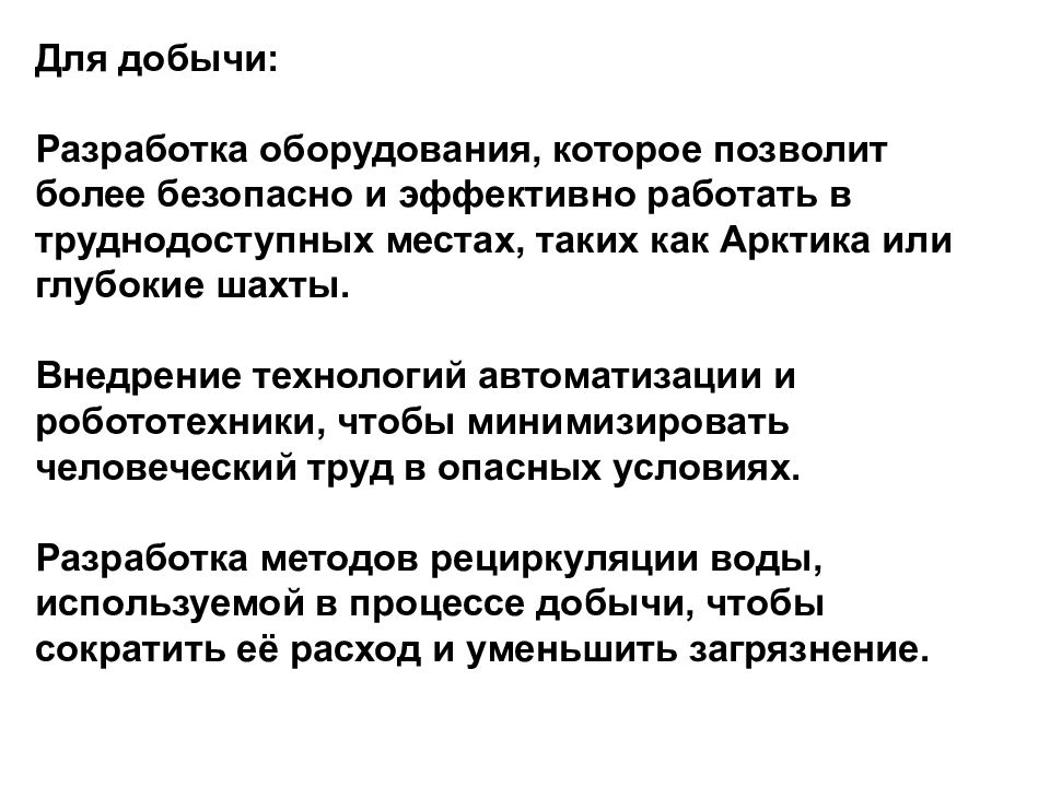 Для добычи: Разработка оборудования, которое позволит более безопасно и эффективно работать в труднодоступных местах, таких как Арктика или глубокие шахты. Внедрение технологий автоматизации и робототехники, чтобы минимизировать человеческий труд в опасных условиях. Разработка методов рециркуляции воды, используемой в процессе добычи, чтобы сократить её расход и уменьшить загрязнение.