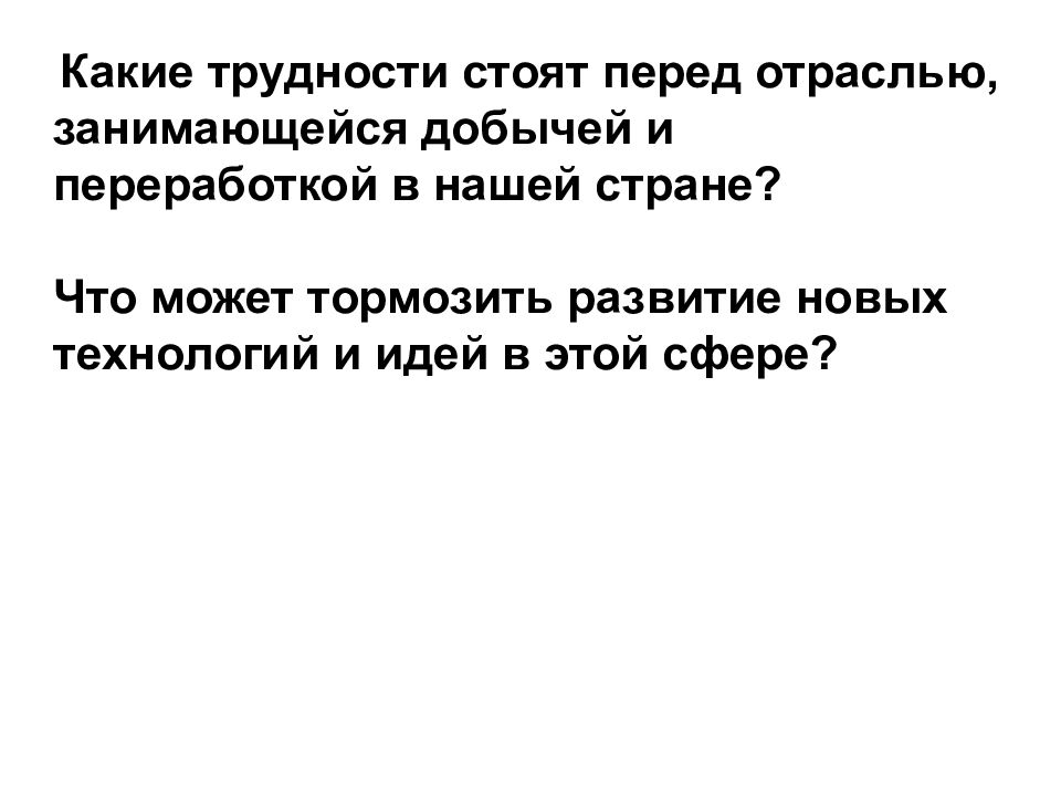 Какие трудности стоят перед отраслью, занимающейся добычей и переработкой в нашей стране? Что может тормозить развитие новых технологий и идей в этой сфере?