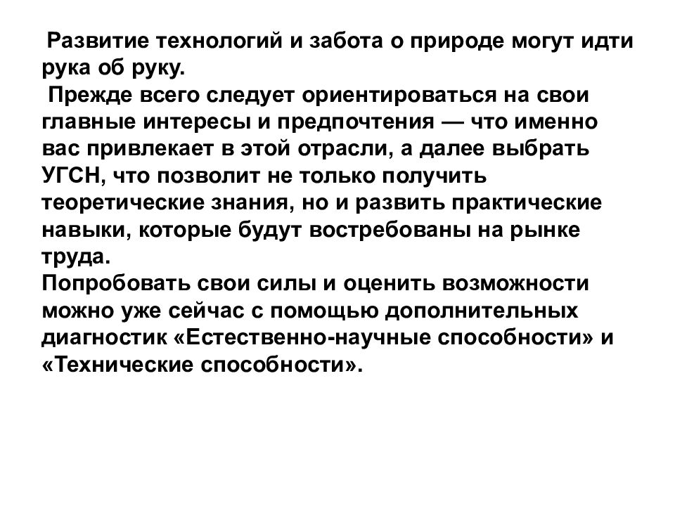 Развитие технологий и забота о природе могут идти рука об руку. Прежде всего следует ориентироваться на свои главные интересы и предпочтения — что именно вас привлекает в этой отрасли, а далее выбрать УГСН, что позволит не только получить теоретические знания, но и развить практические навыки, которые будут востребованы на рынке труда. Попробовать свои силы и оценить возможности можно уже сейчас с помощью дополнительных диагностик «Естественно-научные способности» и «Технические способности».