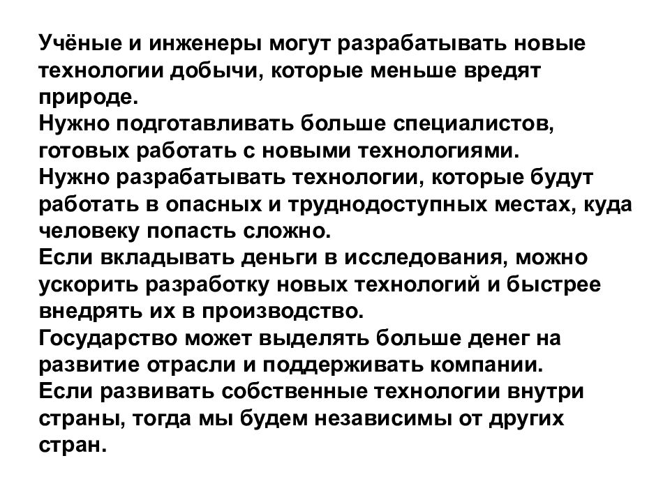 Учёные и инженеры могут разрабатывать новые технологии добычи, которые меньше вредят природе. Нужно подготавливать больше специалистов, готовых работать с новыми технологиями. Нужно разрабатывать технологии, которые будут работать в опасных и труднодоступных местах, куда человеку попасть сложно. Если вкладывать деньги в исследования, можно ускорить разработку новых технологий и быстрее внедрять их в производство. Государство может выделять больше денег на развитие отрасли и поддерживать компании. Если развивать собственные технологии внутри страны, тогда мы будем независимы от других стран.