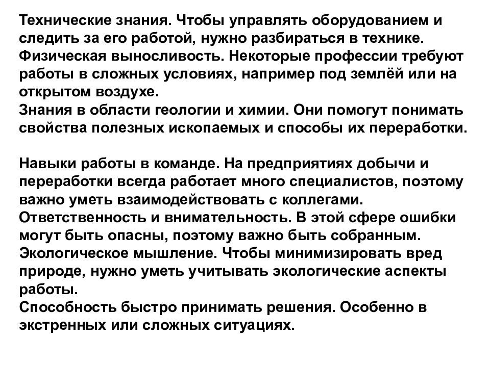 Технические знания. Чтобы управлять оборудованием и следить за его работой, нужно разбираться в технике. Физическая выносливость. Некоторые профессии требуют работы в сложных условиях, например под землёй или на открытом воздухе. Знания в области геологии и химии. Они помогут понимать свойства полезных ископаемых и способы их переработки. Навыки работы в команде. На предприятиях добычи и переработки всегда работает много специалистов, поэтому важно уметь взаимодействовать с коллегами. Ответственность и внимательность. В этой сфере ошибки могут быть опасны, поэтому важно быть собранным. Экологическое мышление. Чтобы минимизировать вред природе, нужно уметь учитывать экологические аспекты работы. Способность быстро принимать решения. Особенно в экстренных или сложных ситуациях.