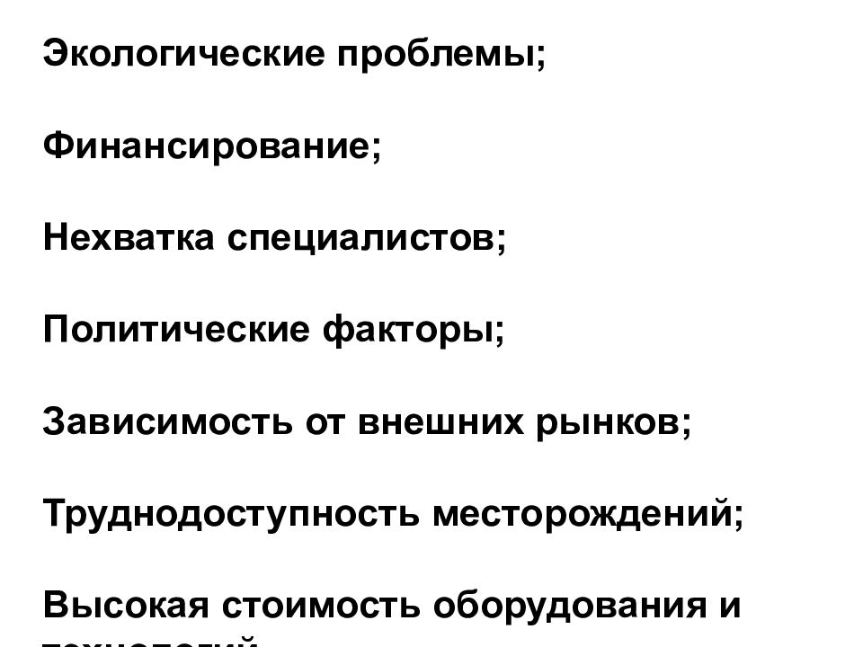 Экологические проблемы; Финансирование; Нехватка специалистов; Политические факторы; Зависимость от внешних рынков; Труднодоступность месторождений; Высокая стоимость оборудования и технологий.