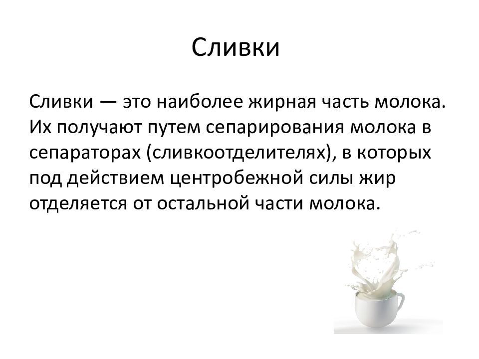 Сливки — это наиболее жирная часть молока. Их получают путем сепарирования молока в сепараторах (сливкоотделителях), в которых под действием центробежной силы жир отделяется от остальной части молока.