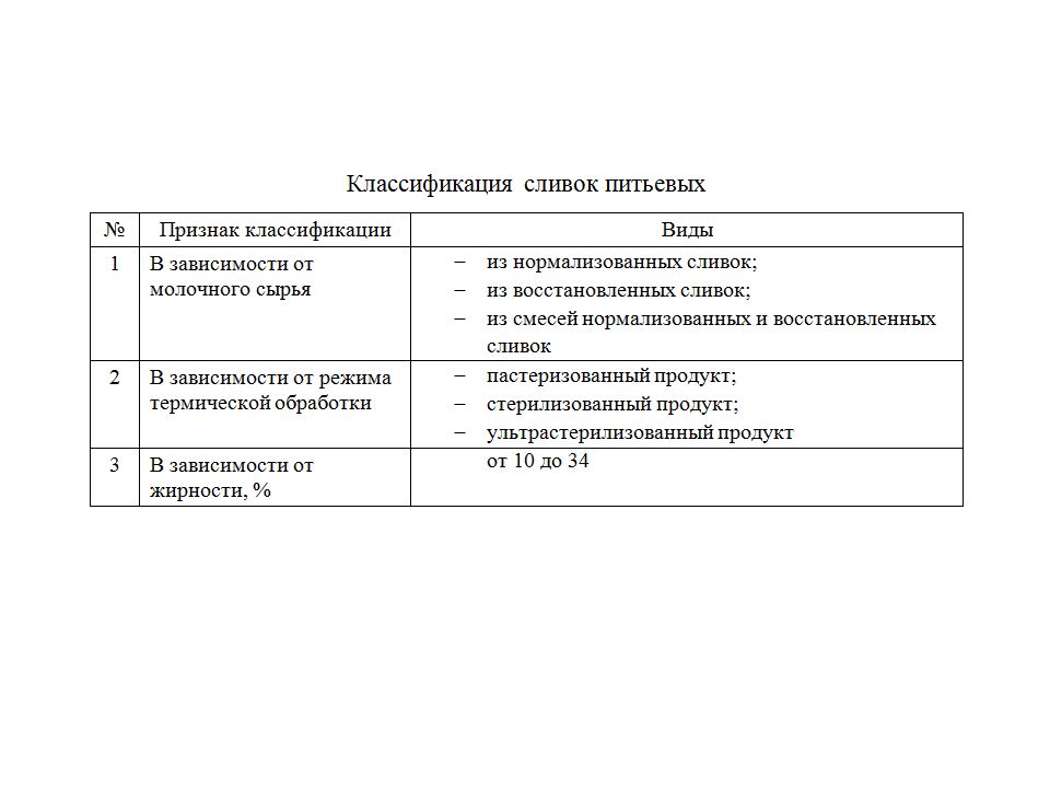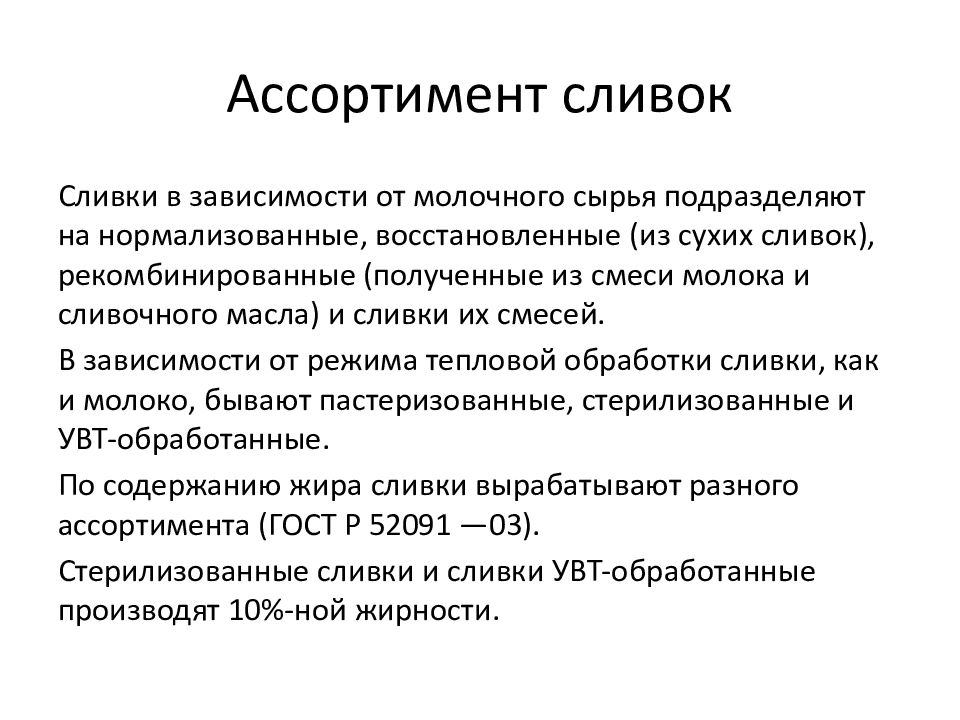 Сливки в зависимости от молочного сырья подразделяют на нормализованные, восстановленные (из сухих сливок), рекомбинированные (полученные из смеси молока и сливочного масла) и сливки их смесей. В зависимости от режима тепловой обработки сливки, как и молоко, бывают пастеризованные, стерилизованные и УВТ-обработанные. По содержанию жира сливки вырабатывают разного ассортимента (ГОСТ Р 52091 —03 ). Стерилизованные сливки и сливки УВТ-обработанные производят 10%-ной жирности.