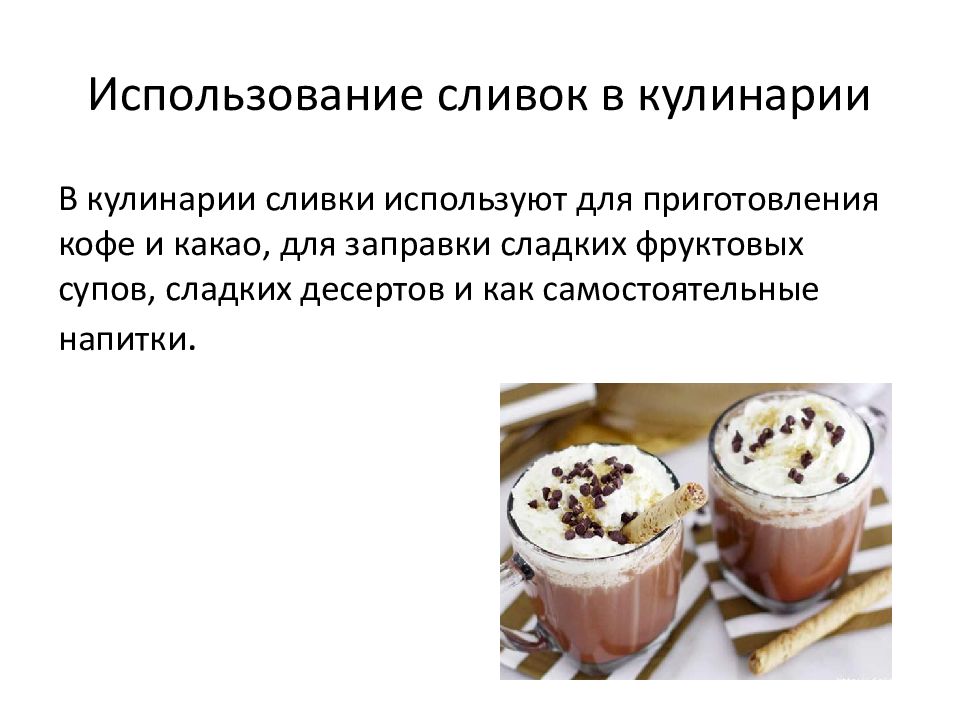 В кулинарии сливки используют для приготовления кофе и какао, для заправки сладких фруктовых супов, сладких десертов и как самостоятельные напитки.