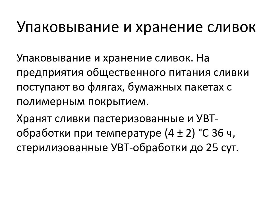 Упаковывание и хранение сливок. На предприятия общественного питания сливки поступают во флягах, бумажных пакетах с полимерным покрытием. Хранят сливки пастеризованные и УВТ-обработки при температуре (4 ± 2) °С 36 ч, стерилизованные УВТ-обработки до 25 сут.