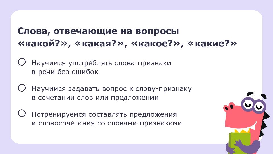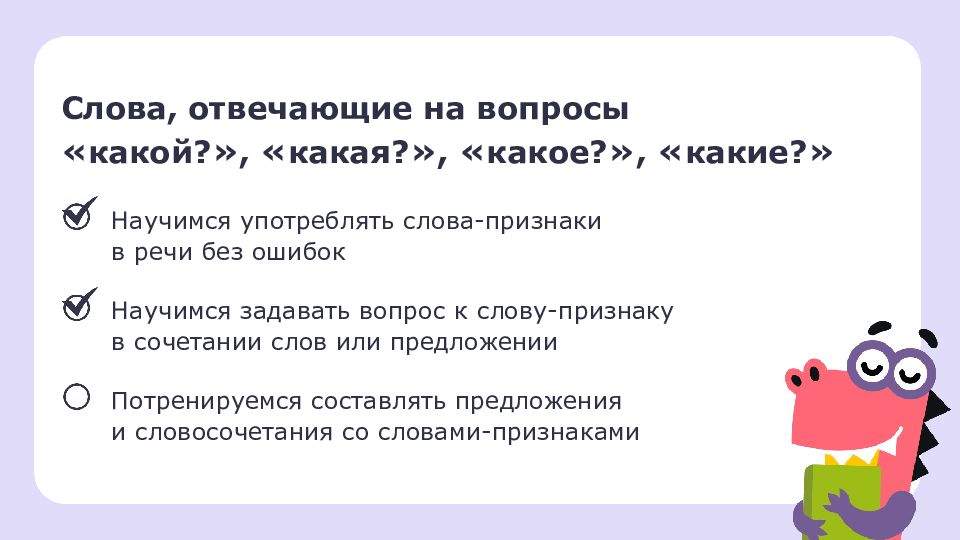 Слова, отвечающие на вопросы « какой? », « какая? », « какое? », « какие? » Научимся употреблять слова-признаки в речи без ошибок Научимся задавать вопрос к слову-признаку в сочетании слов или предложении Потренируемся составлять предложения и словосочетания со словами-признаками