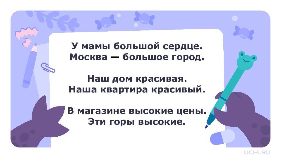У мамы большой сердце. Москва — большое город. Наш дом красивая. Наша квартира красивый. В магазине высокие цены. Эти горы высокие.