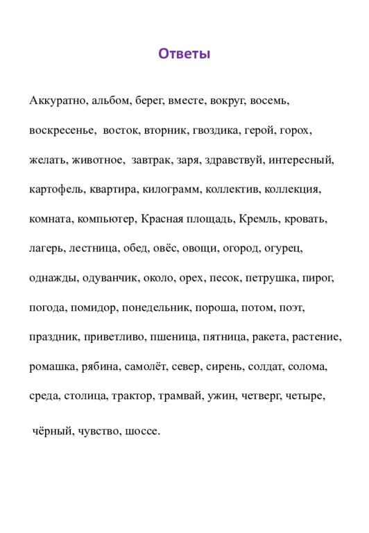 Аккуратно, альбом, берег, вмест е, вокруг, восемь, воскресенье, восток, вторник, гвоздика, герой, горох, желать, животное, завтрак, заря, здравствуй, интересный, картофель, квартира, килограмм, коллектив, коллекция, комната, компьютер, Красная площадь, Кремль, кровать, лагерь, лестница, обед, овёс, овощи, огород, огурец, однажды, одуванчик, около, орех, песок, петрушка, пирог, погода, помидор, понедельник, пороша, потом, поэт, праздник, приветливо, пшеница, пятница, ракета, растение, ромашка, рябина, самолёт, север, сирень, солдат, солома, среда, столица, трактор, трамвай, ужин, четверг, четыре, чёрный, чувство, шоссе.