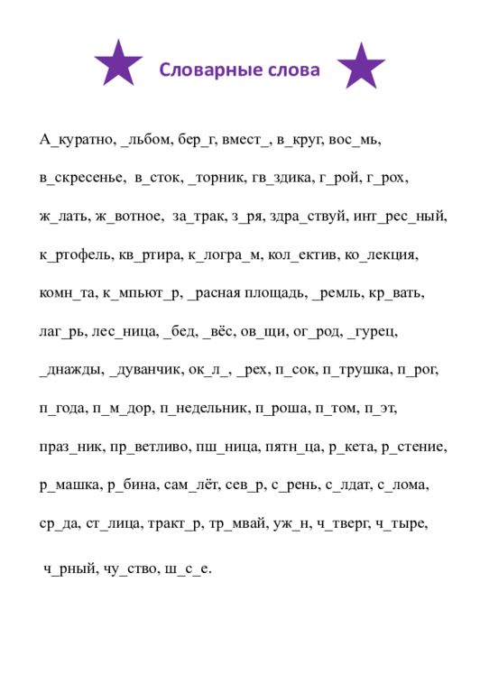 А_куратно, _ льбом, бер_г, вмест _, в_круг, вос_мь, в_скресенье, в_сток, _ торник, гв_здика, г_рой, г_рох, ж_лать, ж_вотное, за_трак, з_ря, здра_ствуй, инт_рес_ный, к_ртофель, кв_ртира, к_логра_м, кол_ектив, ко_лекция, комн _ та, к_мпьют_р, _ расная площадь, _ ремль, кр_вать, лаг_рь, лес_ница, _бед, _ вёс, ов_щи, ог_род, _ гурец, _ днажды, _ дуванчик, ок_л _, _ рех, п_сок, п_трушка, п_рог, п_года, п_м_дор, п_недельник, п_роша, п_том, п_эт, праз_ник, пр_ветливо, пш_ница, пятн_ца, р_кета, р_стение, р_машка, р_бина, сам_лёт, сев_р, с_рень, с_лдат, с_лома, ср_да, ст_лица, тракт_р, тр_мвай, уж_н, ч_тверг, ч_тыре, ч_рный, чу_ство, ш_с_е.