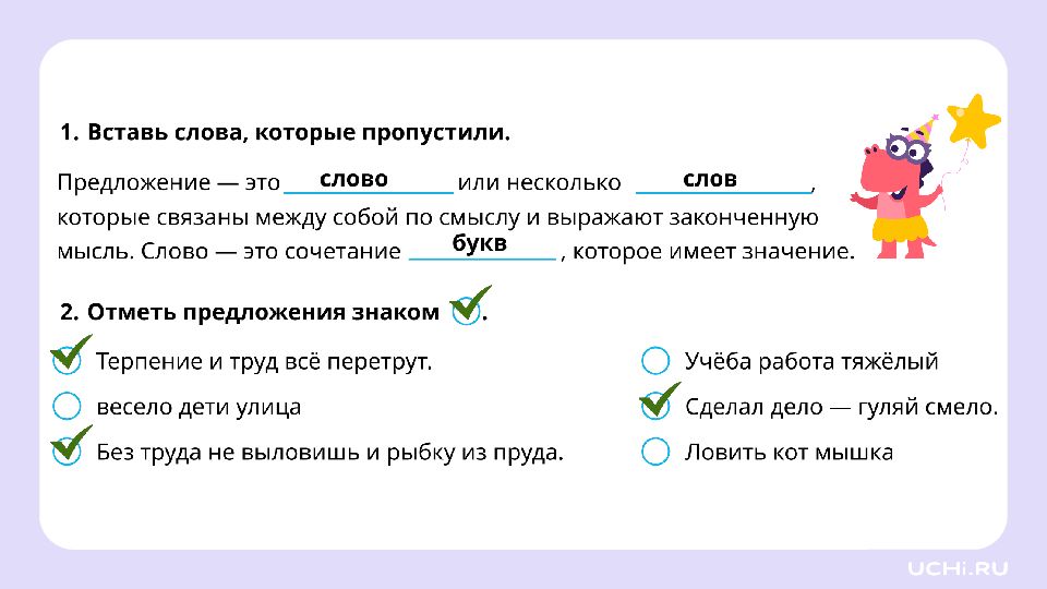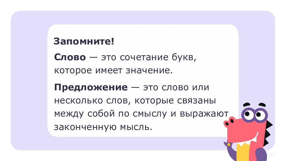 Запомните! Слово — это сочетание букв, которое имеет значение. Предложение — это слово или несколько слов, которые связаны между собой по смыслу и выражают законченную мысль.