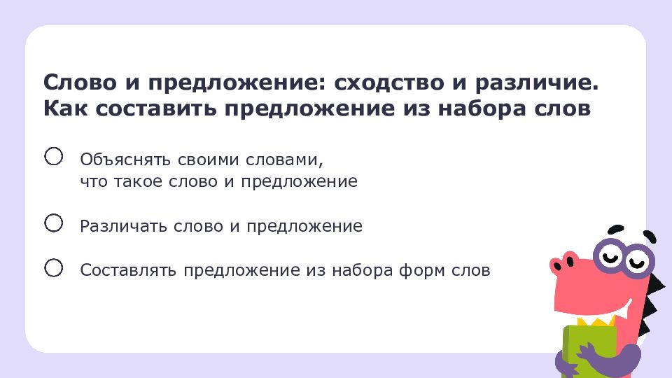 Объяснять своими словами, что такое слово и предложение Р азличать слово и предложение Составлять предложение из набора форм слов Слово и предложение: сходство и различие. Как составить предложение из набора слов