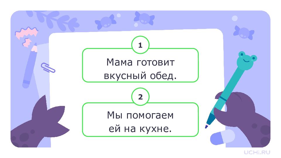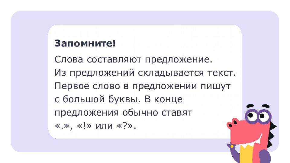 Запомните! Слова составляют предложение. Из предложений складывается текст. Первое слово в предложении пишут с большой буквы. В конце предложения обычно ставят «.», «!» или «?».