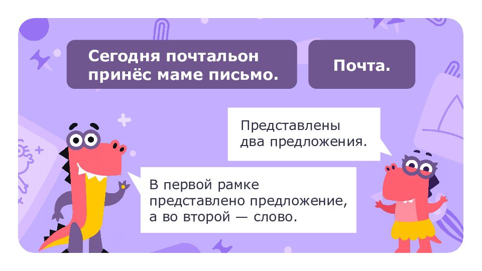 Сегодня почтальон принёс маме письмо. Почта. В первой рамке представлено предложение, а во второй — слово. Представлены два предложения.