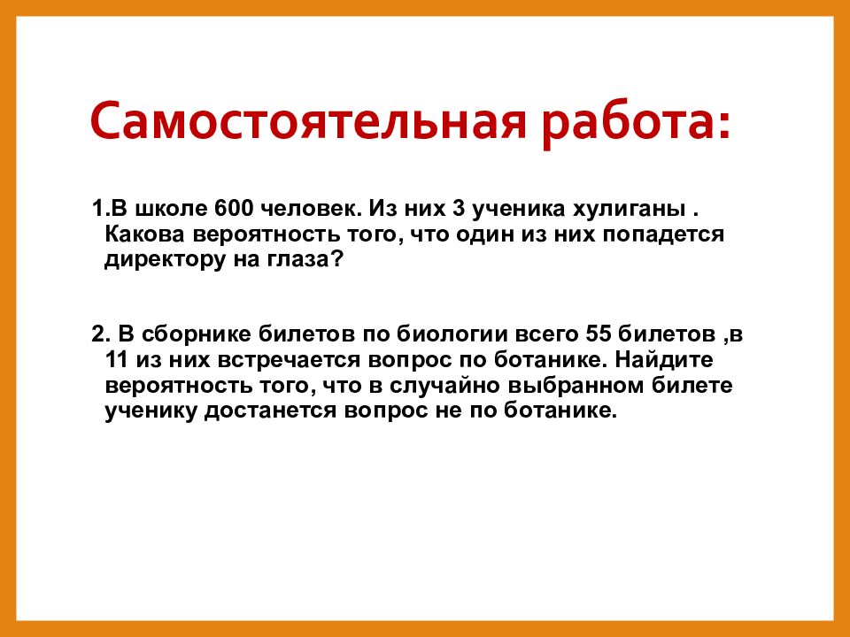 1.В школе 600 человек. Из них 3 ученика хулиганы. Какова вероятность того, что один из них попадется директору на глаза? 2. В сборнике билетов по биологии всего 55 билетов,в 11 из них встречается вопрос по ботанике. Найдите вероятность того, что в случайно выбранном билете ученику достанется вопрос не по ботанике.