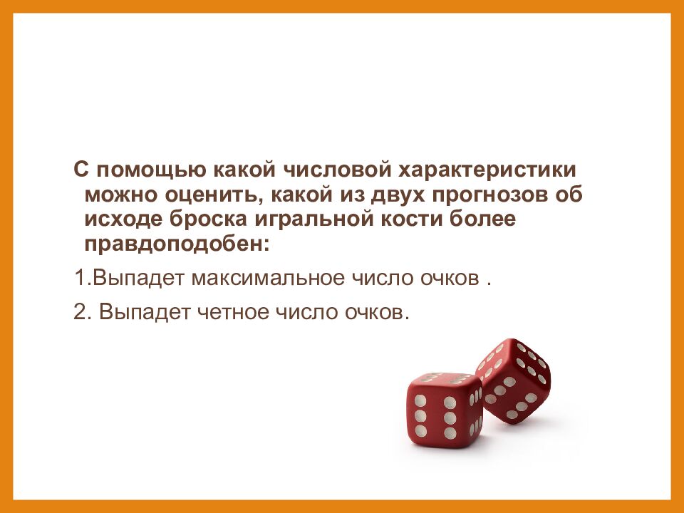 С помощью какой числовой характеристики можно оценить, какой из двух прогнозов об исходе броска игральной кости более правдоподобен: 1.Выпадет максимальное число очков. 2. Выпадет четное число очков.