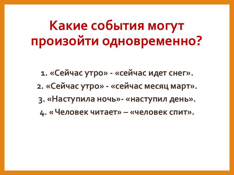 1. «Сейчас утро» - «сейчас идет снег». 2. «Сейчас утро» - «сейчас месяц март». 3. «Наступила ночь»- «наступил день». 4. « Человек читает» – «человек спит».