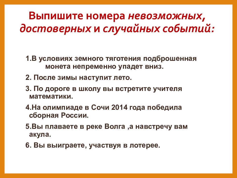 1.В условиях земного тяготения подброшенная монета непременно упадет вниз. 2. После зимы наступит лето. 3. По дороге в школу вы встретите учителя математики. 4.На олимпиаде в Сочи 2014 года победила сборная России. 5.Вы плаваете в реке Волга,а навстречу вам акула. 6. Вы выиграете, участвуя в лотерее.
