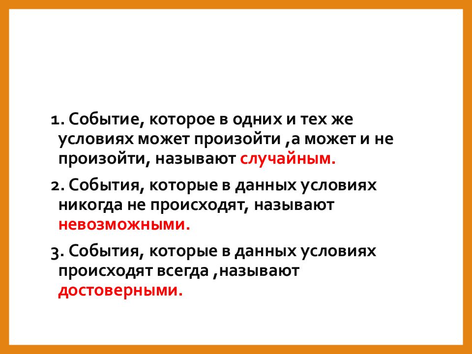 1. Событие, которое в одних и тех же условиях может произойти,а может и не произойти, называют случайным. 2. События, которые в данных условиях никогда не происходят, называют невозможными. 3. События, которые в данных условиях происходят всегда,называют достоверными.