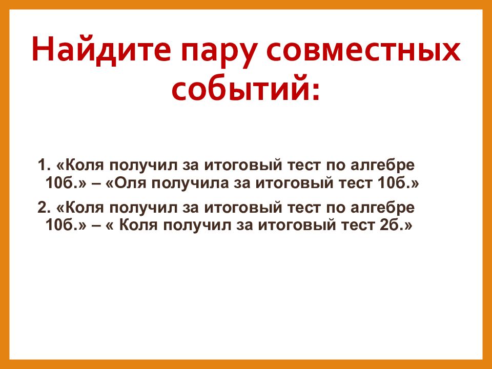 1. «Коля получил за итоговый тест по алгебре 10б.» – «Оля получила за итоговый тест 10б.» 2. «Коля получил за итоговый тест по алгебре 10б.» – « Коля получил за итоговый тест 2б.»
