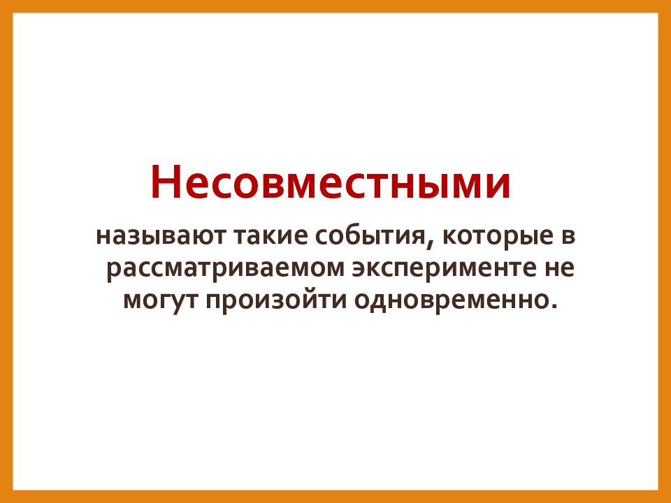 Несовместными называют такие события, которые в рассматриваемом эксперименте не могут произойти одновременно.