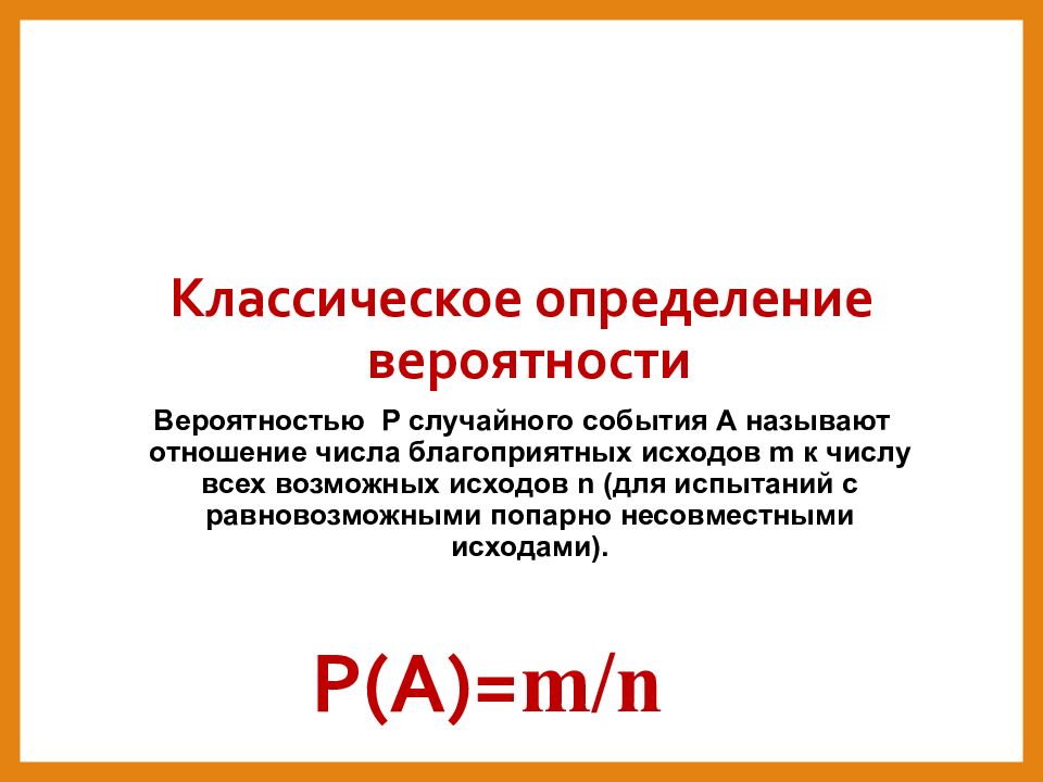 Классическое определение вероятности Вероятностью Р случайного события А называют отношение числа благоприятных исходов m к числу всех возможных исходов n (для испытаний с равновозможными попарно несовместными исходами). P(A )= m/n