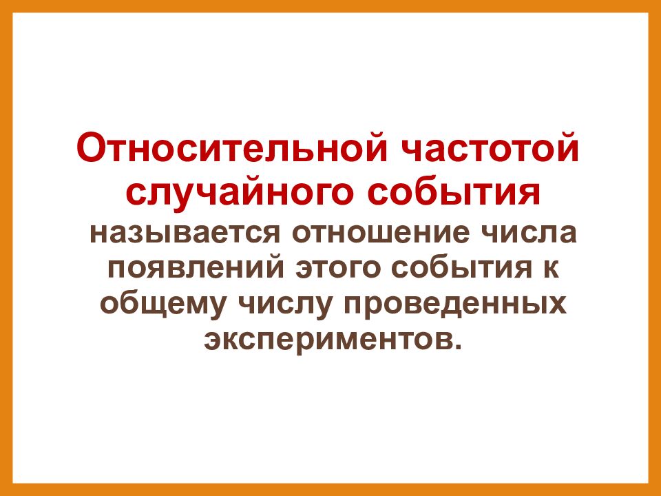 Относительной частотой случайного события называется отношение числа появлений этого события к общему числу проведенных экспериментов.