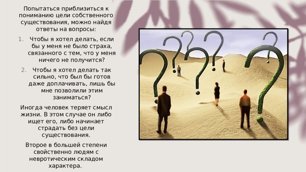 Попытаться приблизиться к пониманию цели собственного существования, можно найдя ответы на вопросы: Чтобы я хотел делать, если бы у меня не было страха, связанного с тем, что у меня ничего не получится? Чтобы я хотел делать так сильно, что был бы готов даже доплачивать, лишь бы мне позволили этим заниматься? Иногда человек теряет смысл жизни. В этом случае он либо ищет его, либо начинает страдать без цели существования. Второе в большей степени свойственно людям с невротическим складом характера. Страдание на фоне отсутствия смысла жизни - один из признаков невротической депрессии.