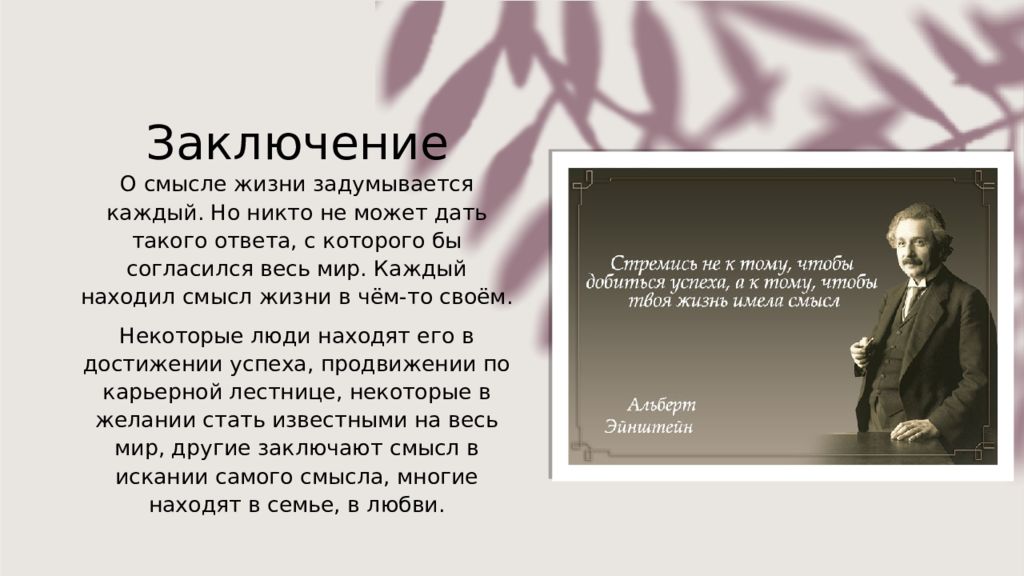 О смысле жизни задумывается каждый. Но никто не может дать такого ответа, с которого бы согласился весь мир. Каждый находил смысл жизни в чём-то своём. Некоторые люди находят его в достижении успеха, продвижении по карьерной лестнице, некоторые в желании стать известными на весь мир, другие заключают смысл в искании самого смысла, многие находят в семье, в любви.