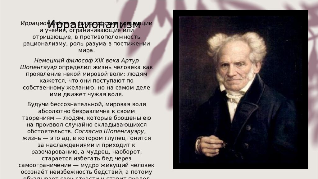 Иррационали́зм — философские концепции и учения, ограничивающие или отрицающие, в противоположность рационализму, роль разума в постижении мира. Немецкий философ XIX века Артур Шопенгауэр определил жизнь человека как проявление некой мировой воли: людям кажется, что они поступают по собственному желанию, но на самом деле ими движет чужая воля. Будучи бессознательной, мировая воля абсолютно безразлична к своим творениям — людям, которые брошены ею на произвол случайно складывающихся обстоятельств. Согласно Шопенгауэру, жизнь — это ад, в котором глупец гонится за наслаждениями и приходит к разочарованию, а мудрец, наоборот, старается избегать бед через самоограничение — мудро живущий человек осознаёт неизбежность бедствий, а потому обуздывает свои страсти и ставит предел своим желаниям.