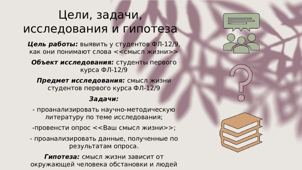 Цель работы: выявить у студентов ФЛ-12/9, как они понимают слова <<смысл жизни>> Объект исследования: студенты первого курса ФЛ-12/9 Предмет исследования: смысл жизни студентов первого курса ФЛ-12/9 Задачи: - проанализировать научно-методическую литературу по теме исследования; - провенсти опрос <<Ваш смысл жизни>>; - проанализировать данные, полученные по результатам опроса. Гипотеза: смысл жизни зависит от окружающей человека обстановки и людей