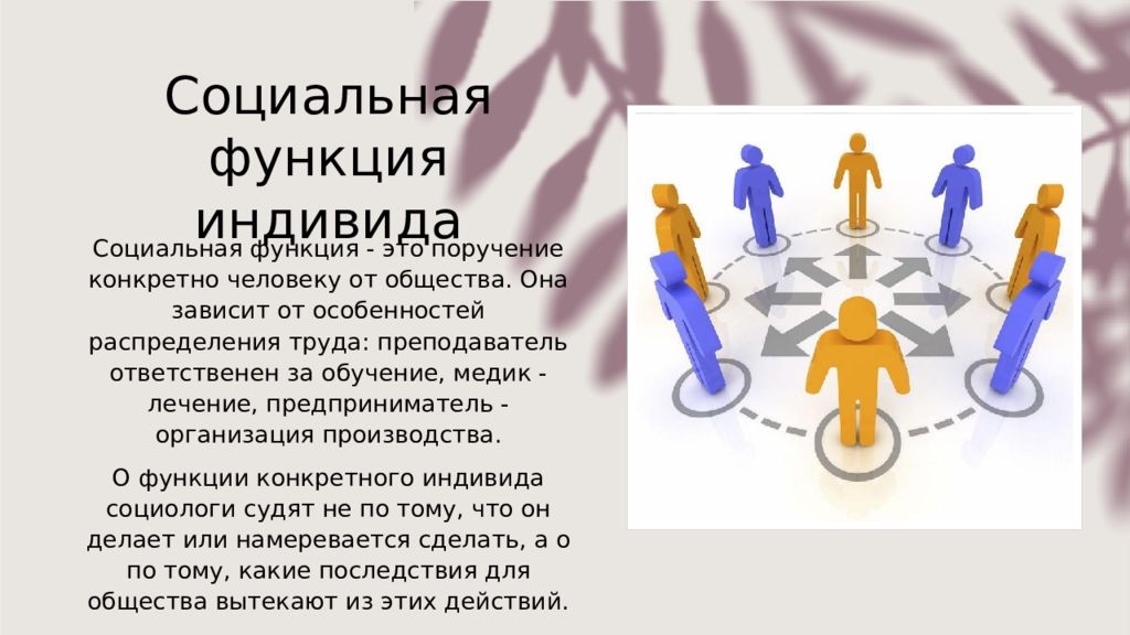 Социальная функция - это поручение конкретно человеку от общества. Она зависит от особенностей распределения труда: преподаватель ответственен за обучение, медик - лечение, предприниматель - организация производства. О функции конкретного индивида социологи судят не по тому, что он делает или намеревается сделать, а о по тому, какие последствия для общества вытекают из этих действий.