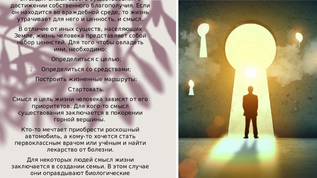 Если условия жизни человека благоприятны, он видит смысл своего существования в достижении собственного благополучия. Если он находится во враждебной среде, то жизнь утрачивает для него и ценность, и смысл. В отличие от иных существ, населяющих Земле, жизнь человека представляет собой набор ценнстей. Для того чтобы овладеть ими, необходимо: Определиться с целью; Определиться со средствами; Построить жизненные маршруты; Стартовать. Смысл и цель жизни человека зависят от его приоритетов. Для кого-то смысл существования заключается в покорении горной вершины. Кто-то мечтает приобрести роскошный автомобиль, а кому-то хочется стать первоклассным врачом или учёным и найти лекарство от болезни. Для некоторых людей смысл жизни заключается в создании семьи. В этом случае они оправдывают биологические предназначение человека, которое заключаетсяв продолжении рода.