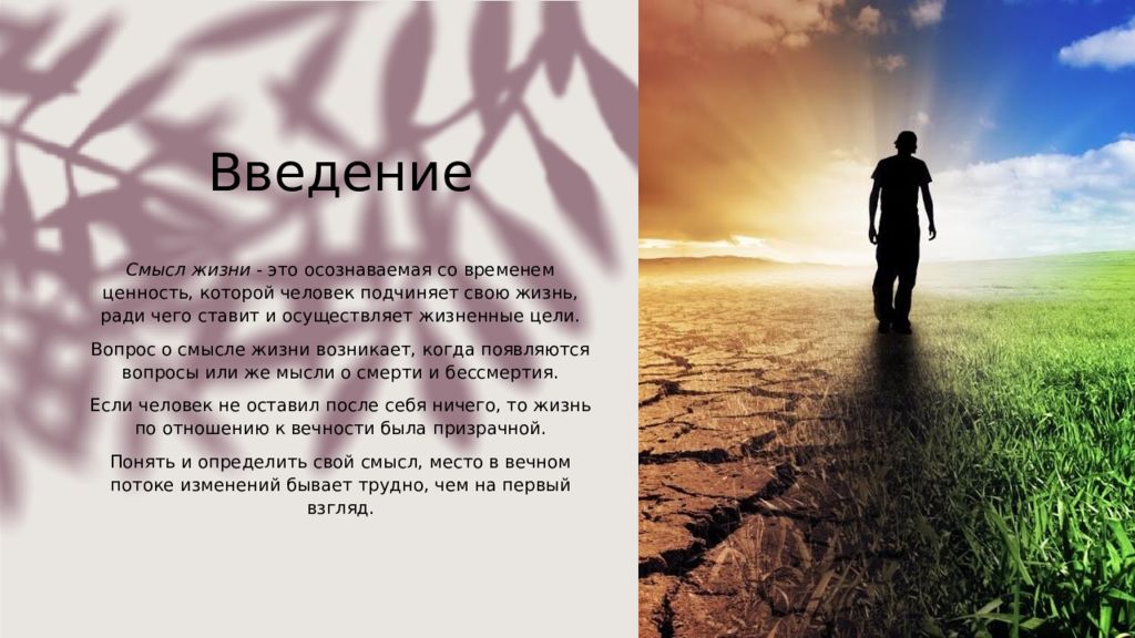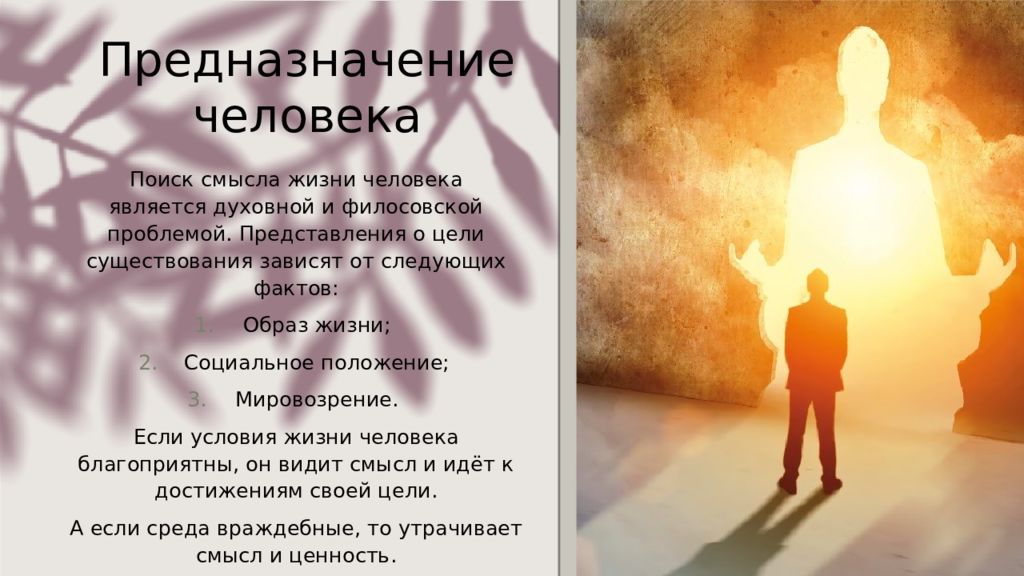 Поиск смысла жизни человека является духовной и филосовской проблемой. Представления о цели существования зависят от следующих фактов : Образ жизни; Социальное положение; Мировозрение. Если условия жизни человека благоприятны, он видит смысл и идёт к достижениям своей цели. А если среда враждебные, то утрачивает смысл и ценность.