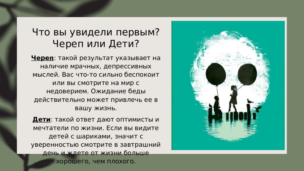 Череп : такой результат указывает на наличие мрачных, депрессивных мыслей. Вас что-то сильно беспокоит или вы смотрите на мир с недоверием. Ожидание беды действительно может привлечь ее в вашу жизнь. Дети : такой ответ дают оптимисты и мечтатели по жизни. Если вы видите детей с шариками, значит с уверенностью смотрите в завтрашний день и ждете от жизни больше хорошего, чем плохого.