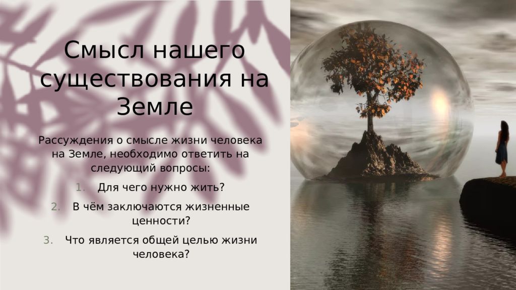 Рассуждения о смысле жизни человека на Земле, необходимо ответить на следующий вопросы: Для чего нужно жить? В чём заключаются жизненные ценности? Что является общей целью жизни человека?