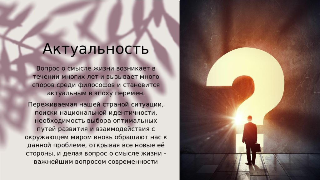 Вопрос о смысле жизни возникает в течении многих лет и вызывает много споров среди философов и становится актуальным в эпоху перемен. Переживаемая нашей страной ситуации, поиски национальной идентичности, необходимость выбора оптимальных путей развития и взаимодействия с окружающем миром вновь обращают нас к данной проблеме, открывая все новые её стороны, и делая вопрос о смысле жизни - важнейшим вопросом современности