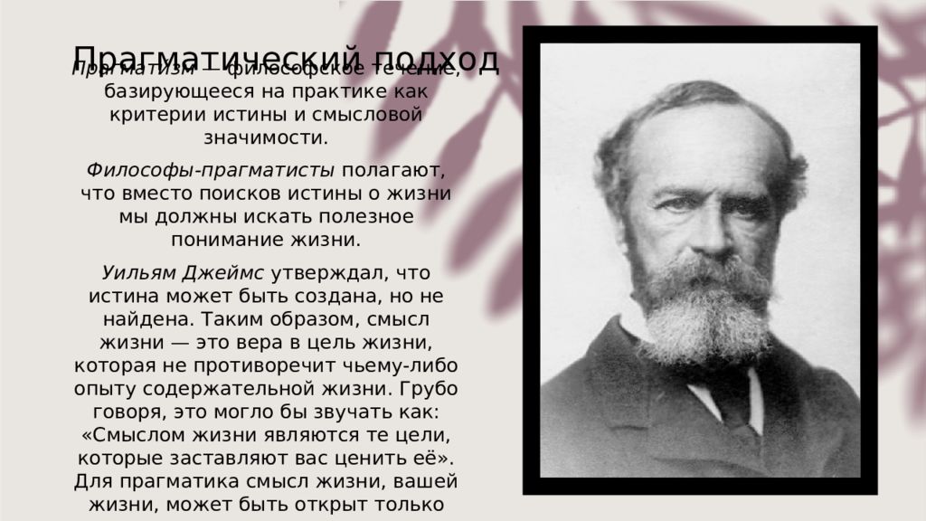 Прагмати́зм — философское течение, базирующееся на практике как критерии истины и смысловой значимости. Философы-прагматисты полагают, что вместо поисков истины о жизни мы должны искать полезное понимание жизни. Уильям Джеймс утверждал, что истина может быть создана, но не найдена. Таким образом, смысл жизни — это вера в цель жизни, которая не противоречит чьему-либо опыту содержательной жизни. Грубо говоря, это могло бы звучать как: «Смыслом жизни являются те цели, которые заставляют вас ценить её». Для прагматика смысл жизни, вашей жизни, может быть открыт только через опыт.