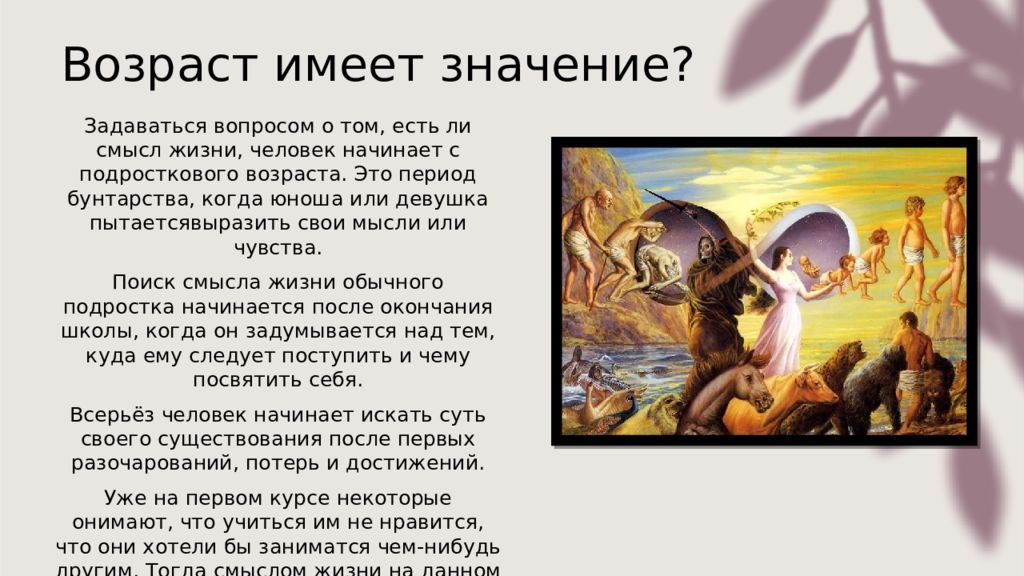 Задаваться вопросом о том, есть ли смысл жизни, человек начинает с подросткового возраста. Это период бунтарства, когда юноша или девушка пытаетсявыразить свои мысли или чувства. Поиск смысла жизни обычного подростка начинается после окончания школы, когда он задумывается над тем, куда ему следует поступить и чему посвятить себя. Всерьёз человек начинает искать суть своего существования после первых разочарований, потерь и достижений. Уже на первом курсе некоторые онимают, что учиться им не нравится, что они хотели бы заниматся чем-нибудь другим. Тогда смыслом жизни на данном этапе становится обретение той профессии, которая им действительно по душе.